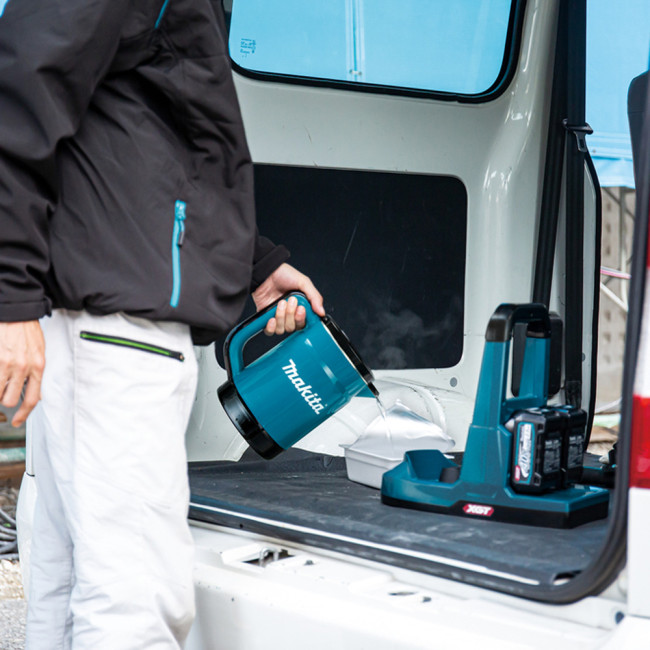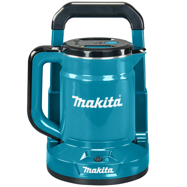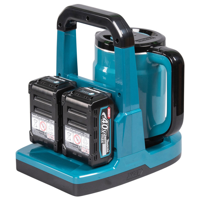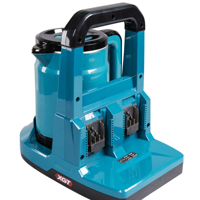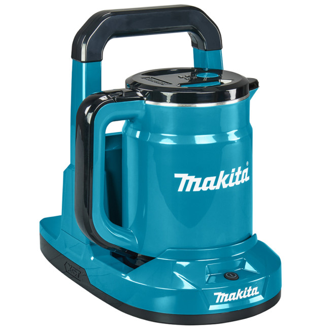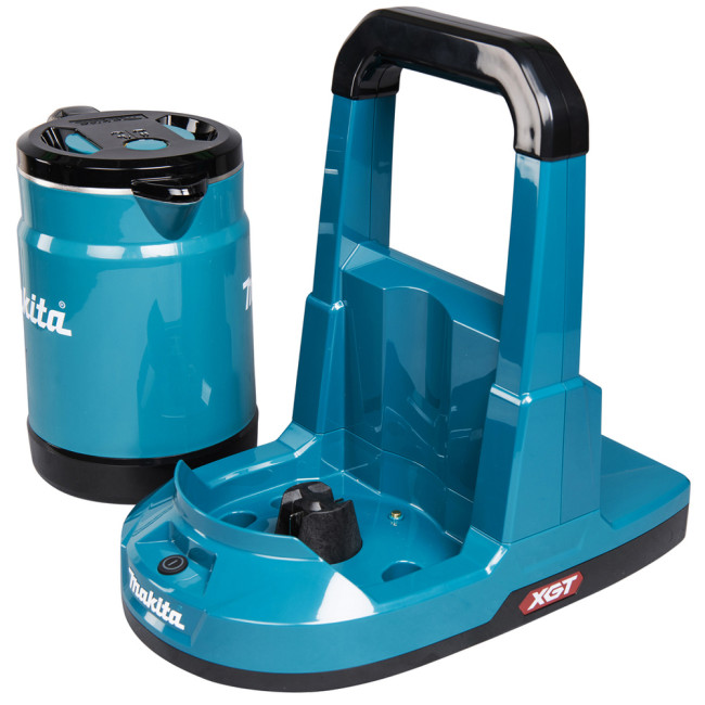 Аккумуляторный чайник Makita KT001GZ позволит вскипятить воду без привязки к розетке. Внешний корпус чайника сделан из пластика, который сохраняет поверхность теплой, а воду дольше горячей. Цельнометаллическая колба объемом 800 мл предотвращает образование протечек. Внутри колбы выбита мерная шкала. Крышка оснащена съемным металлическим фильтром и клапаном, который предотвращает разбрызгивание воды или проливание при транспортировке. Док-станция оснащена двумя портами для аккумуляторов и удобной ручкой для транспортировки. Во время нагрева индикатор мигает оранжевым, при достижении 100 °C подает сигнал на протяжении 5 секунд.