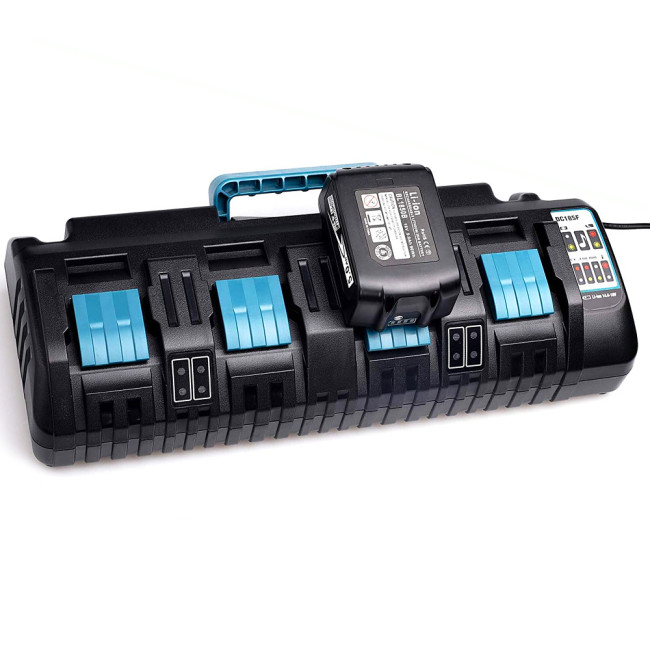 Зарядное устройство для четырех аккумуляторов LXT® 14,4 В и 18 В со слайдерным механизмом. Имеет охлаждающий вентилятор, который охлаждает аккумулятор для ускорения зарядки. Зарядка оптимизирована с точки зрения напряжения, силы тока и температуры. Заряжает по две батареи одновременно; зарядка четырех батарей 5,0 А·ч занимает 220 минут.