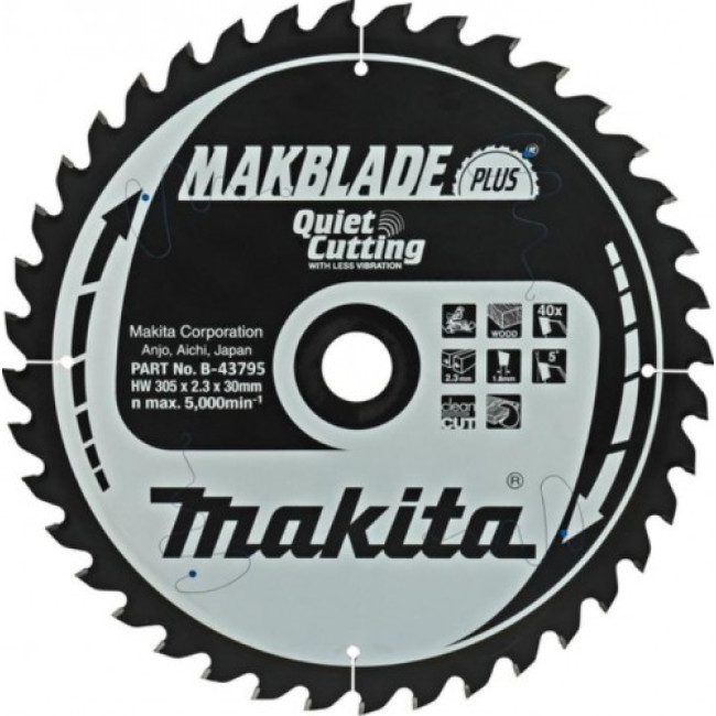 Пильный диск для дерева, 305x30x1.8x40T, MAKBLADE PLUS, Makita B-43795. Пильный диск по дереву Makita B-43795 изготовлен из твердосплавной стали и предназначен для точного и чистого реза. Специальная форма зуба (ATB) легко режет волокнистые материалы. Серия MAKBLADE PLUS - это диск уменьшенной толщины, которая снижает нагрузку на инструмент. Лезвие диска покрыто защитным слоем, предохраняющим от накипания смолы, краски, клея и других вязких веществ. Закаленное и строго отбалансированное лезвия обеспечивает точный, прямой и чистый рез. Диски Makita MAKBLADE подходят для высоких нагрузок и продолжительной работы.