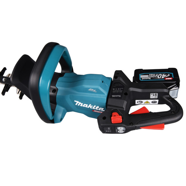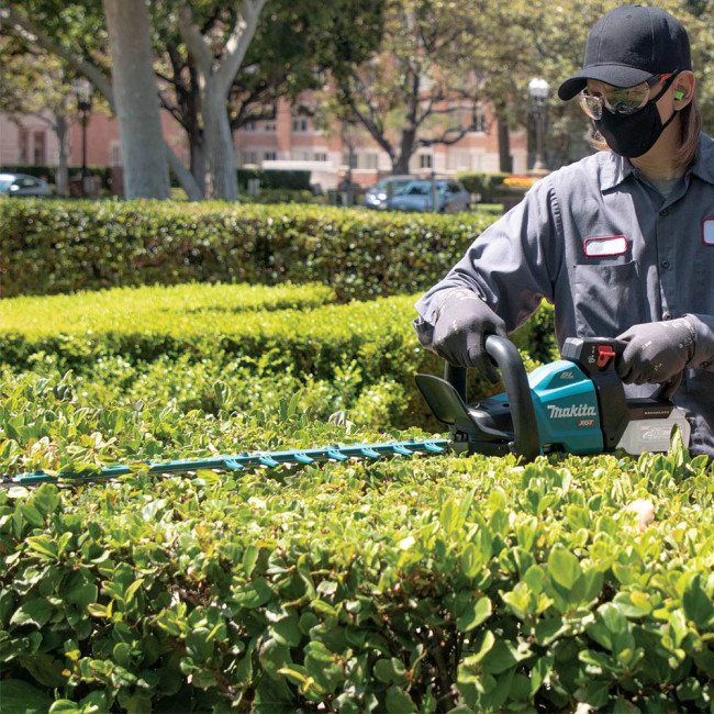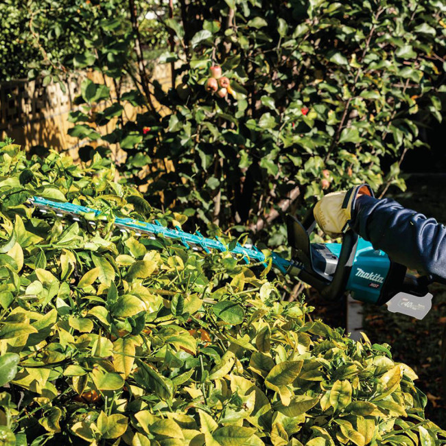 Кусторез Makita UH005GZ применяется для подрезки живой изгороди. Работает от независимого источника питания, малошумен и удобен в эксплуатации. Надёжный бесщеточный двигатель не требует технического обслуживания. Для безопасного удаления скопившегося мусора в инструменте возможна активация реверсивного движения лезвий. Заднюю рукоятку можно установить в 5 положениях. Для безопасности оператора предусмотрен рычаг блокировки в выключенном положении.