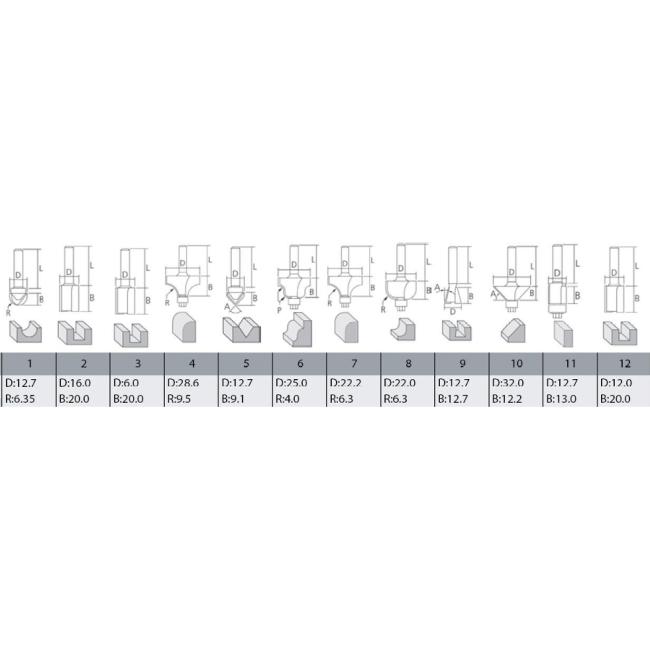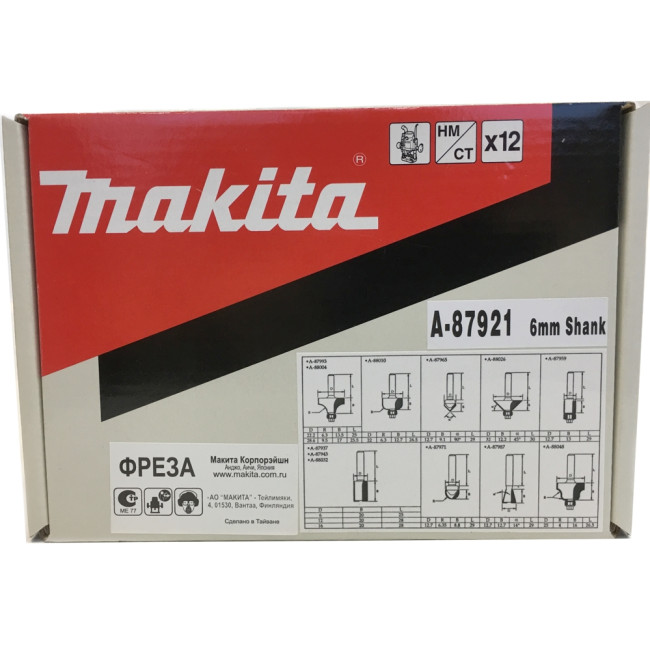 Набор из двенадцати фрез Makita A-87921 с хвостовиком 6 мм. Набор Макита A-87921 используется в качестве оснастки при выполнении различных операций, например, при выемке пазов, обработке кромок. Данный набор A-87921 Makita применяют как в домашних условиях, так и на производстве или в мастерских.