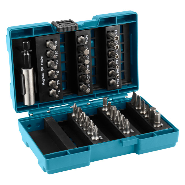Набор насадок Makita B-28606 состоит из 37 предметов. Включает в себя 36 бит и магнитный держатель. Насадки упакованы в закрывающийся пластиковый пенал. Биты имеют длину 25 мм. Особенность набора состоит в том, что места для бит подписаны и их можно будет заменять на новые, не путая места.