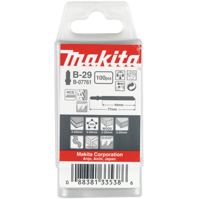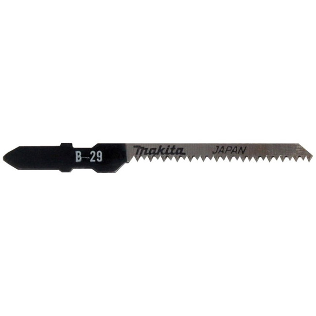 Полотно для лобзика HCS B-29, заточка со свободным углом резания. Для чистых пропилов: дерева, многослойной фанеры и пластика. Пилка используются с электролобзиком Макита. Пилки применяются для распиливания различных материалов, как дерево, пластик и фанера. Изготовлены из высокоуглеродистой стали, что гарантирует высокую производительность полотен и их прочность. Пилки обеспечивают чистый фигурный рез без сколов не требующий дополнительной обработки шлифованием.