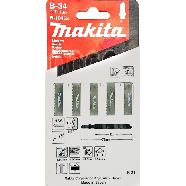 Лобзиковая пилка для нержавеющей стали, 52 мм, HSS, T118A, 18TPI, В-34, 5 шт Makita B-10453