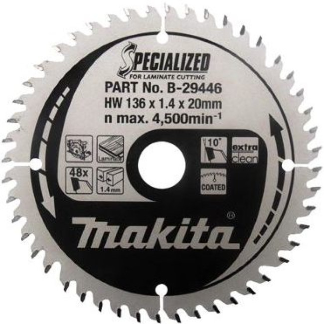 Пильный диск для ламината Makita B-31186 предназначен для резки ламината. Диск обладает длительным сроком службы и отличной производительностью. Благодаря трапециевидной форме зубов, диск при резке не оставляет зазубрин, а специальное покрытие уменьшает образование коррозии и трения для предотвращения нагрева лезвия. Звукоизоляционные и антивибрационные слоты заполнены смолой.Купить товар - Диск пильный для ламината, 136x1.0x20 мм, 48T, TCG для аккумуляторных пил DCS552 Makita B-31186 очень просто, достаточно положить товар в «корзину» и оформить заказ или позвонить нам по телефону, так же можно для Вашего удобства, отправить заявку на Е-майл.