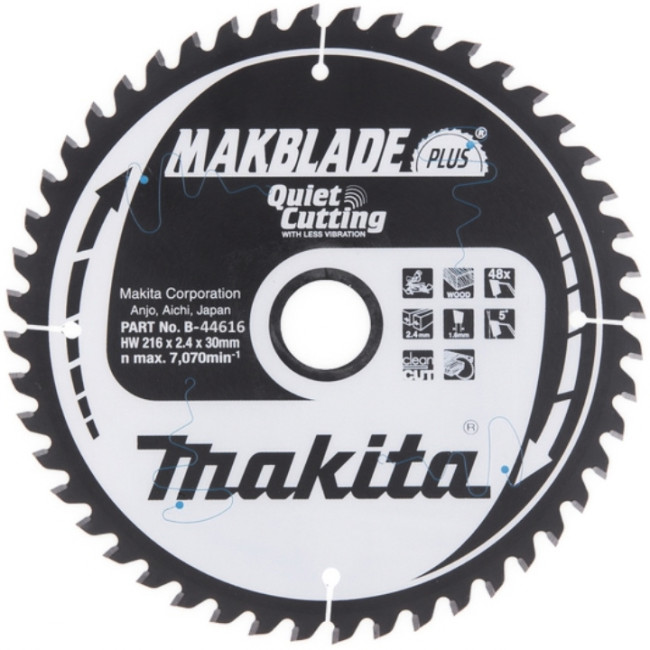 Пильный диск Makblade-Plus Makita B-44616 – твердосплавный диск высокого класса с низким износом для долгой работы. Диск подходит для беспроводных торцовочных пил. Закаленное и точно отбалансированное лезвие способно поглощать удары и обеспечивает точный и прямой рез.Лезвие диска покрыто защитным слоем, снижающим трение и уровень шума и предохраняющим от налипания смолы, краски или клея. Купить пильный диск для дерева Makblade-Plus 216x2.4x30 мм, 48T, ATB Makita B-44616, очень просто, достаточно положить товар в «корзину» и оформить заказ или позвонить нам по телефону, так же можно для Вашего удобства, отправить заявку на Е-майл.