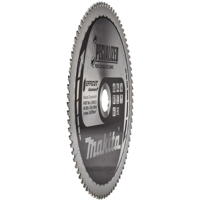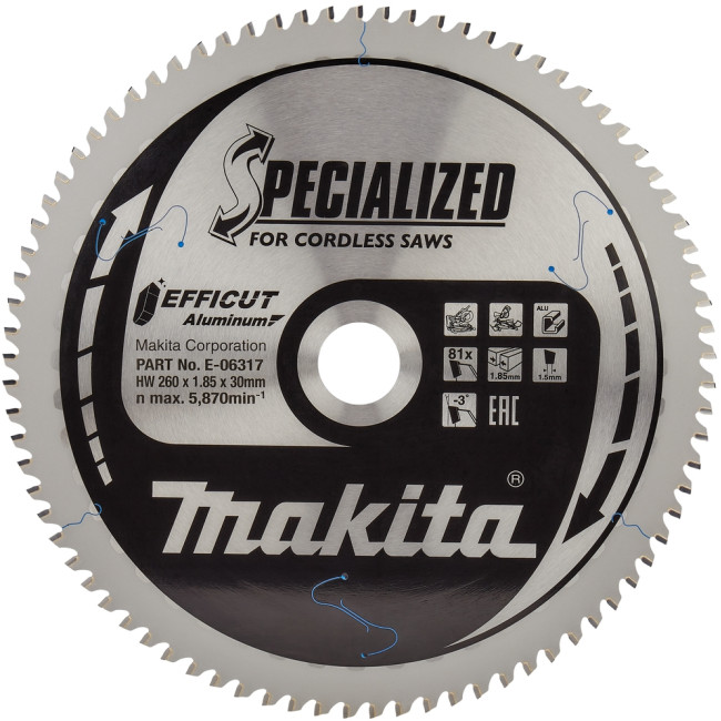 Пильный диск Efficut по алюминию для торцовочной пилы с 81 зубцом и углом атаки -3 градуса, толщина диска 1.85 мм. Пильное полотно Efficut - особенно эффективное пильное полотно благодаря новой конструкции зубьев. Зуб имеет полый вырез. В результате зуб имеет меньшую поверхность контакта с обрабатываемым материалом, он более острый и может лучше избавляться от обработки через подбарабанье. Также имеется лазерная прорезь для снижения вибрации и шума, а также тефлоновое покрытие, предотвращающее коррозию и адгезию адгезивных материалов. Эти методы и небольшая толщина полотна обеспечивают быстрое и эффективное пиление.