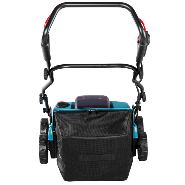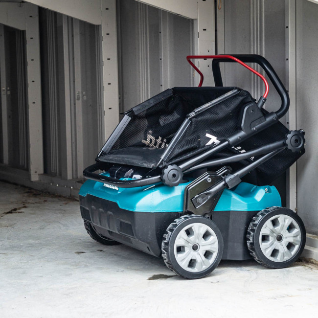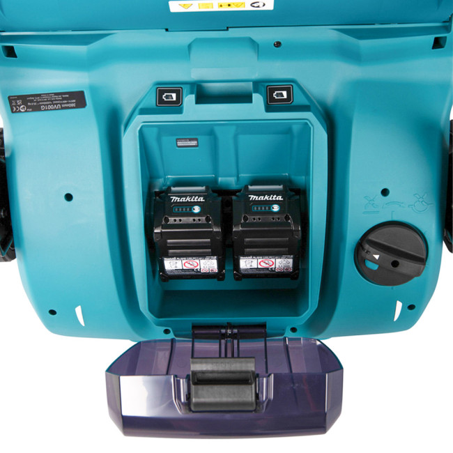 Первый скарификатор Makita UV001GZ на аккумуляторе шириной 38 см. Для ухода за газонами площадью до 500 м². Глубину обработки можно регулировать в 18 положениях от 5 до -12 мм. Работает от одной батареи 40 В, но при установке двух батарей автоматически переключается на вторую батарею для увеличения времени работы. Большой мешок для сбора травы имеет емкость 50 литров. Благодаря большим колесам диаметром 180 мм он имеет хорошее сцепление даже со скользкой поверхностью.