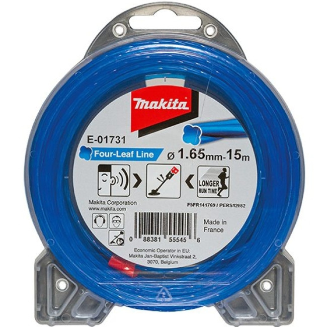 Леска триммерная, витая, бесшумная “Клевер” 1.65 мм, 15 м Makita E-01731 для аккумуляторного триммера BUR141, BUR181, DUR141, DUR181, UR100D, UR180D, UR3000, UR3501. Данная леска легко справится с подрезанием толстых сорняков и жесткой травы. Имеет низкий уровень шума. Для аккумуляторного инструмента - Спиралевидная форма корда позволяет повысить продолжительность работы на одном заряде. Спиральная форма корда обеспечивает снижение завихрений воздуха, которые создаются триммерным кордом круглого сечения. В сравнении с триммерным кордом круглого сечения время работы на одном заряде возрастает на 20% благодаря уменьшению воздушных завихрений. Основной шумовой эффект при работе с травокосилкой создает триммерный корд, а уменьшенное количество завихрений снижает шум во время работы, что делает работу с триммером / травокосилкой более комфортной.