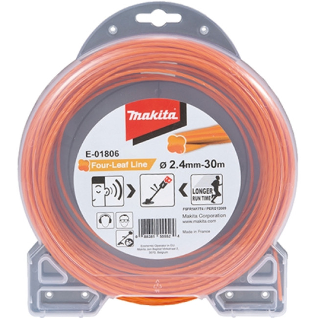 Леска триммерная, витая, бесшумная “Клевер” 2.4 мм, 30 м для триммера DBC260L, DBC260U, DBC4010, DUR142L, DUR182L, DUR184L, DUR187L, DUR190L, DUR364L, DUR368L, DUR369A, DUR369L, EBH341R, EBH341L, EBH341U, EM2600L, EM2600U, EM2651UH, EM2654LH, ER2600R, ER2650LH, UR101C, UR201C, UR3500 Makita E-01806 подойдет для работы с любыми моделями триммеров. Данная леска легко справится с подрезанием толстых сорняков и жесткой травы. Имеет низкий уровень шума. Для аккумуляторного инструмента – Спиралевидная форма корда позволяет повысить продолжительность работы на одном заряде. Спиральная форма корда обеспечивает снижение завихрений воздуха, которые создаются триммерным кордом круглого сечения. В сравнении с триммерным кордом круглого сечения время работы на одном заряде возрастает на 20% благодаря уменьшению воздушных завихрений. Основной шумовой эффект при работе с травокосилкой создает триммерный корд, а уменьшенное количество завихрений снижает шум во время работы, что делает работу с триммером / травокосилкой более комфортной.