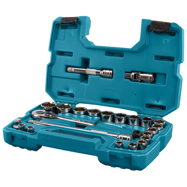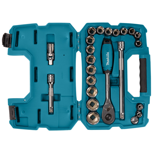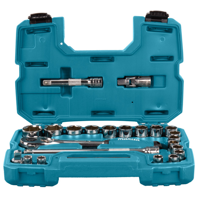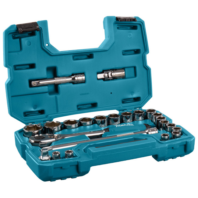 Для крепления болтов. Набор состоит из: трещотки на 84 зубца с приводом 1/2 ", карданного шарнира 1/2", переходника 1/2 "x 3/8", двух удлинителей (125 и 255 мм), коротких головок на 10, 11, 12, 13, 14, 15, 16, 17, 18, 19, 20, 21, 22, 23, 24, 27, 30 и 32 мм.