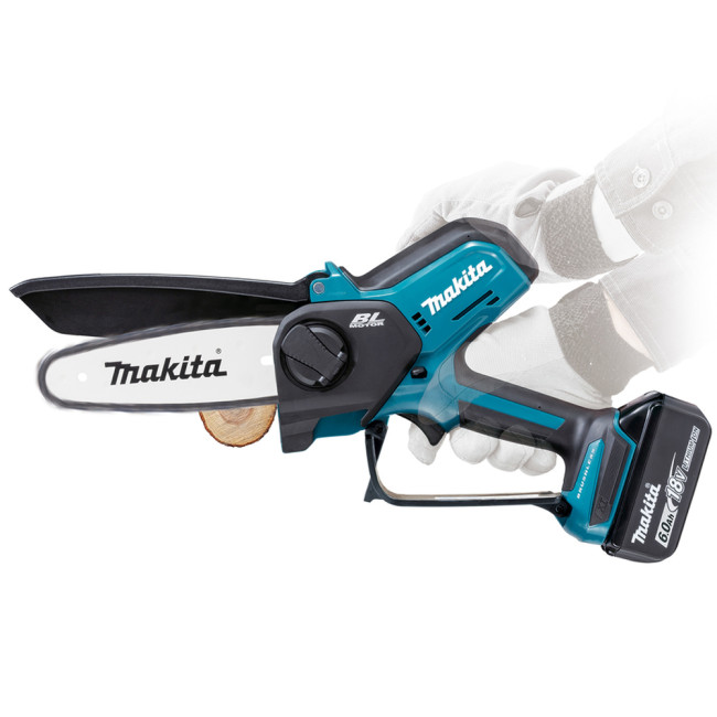 Аккумуляторная цепная мини-пила Makita DUC101SF – практичное по стоимости и по параметрам подходящее многим пользователям устройство. Применяется оно преимущественно для обрезки веток с различных деревьев. Данный агрегат может быть крайне полезен людям, которые периодически работают в садах, на дачах, во дворах загородных домов. Длина шины 10 см. Функционирует она от батарей различной емкости и напряжением 18V.