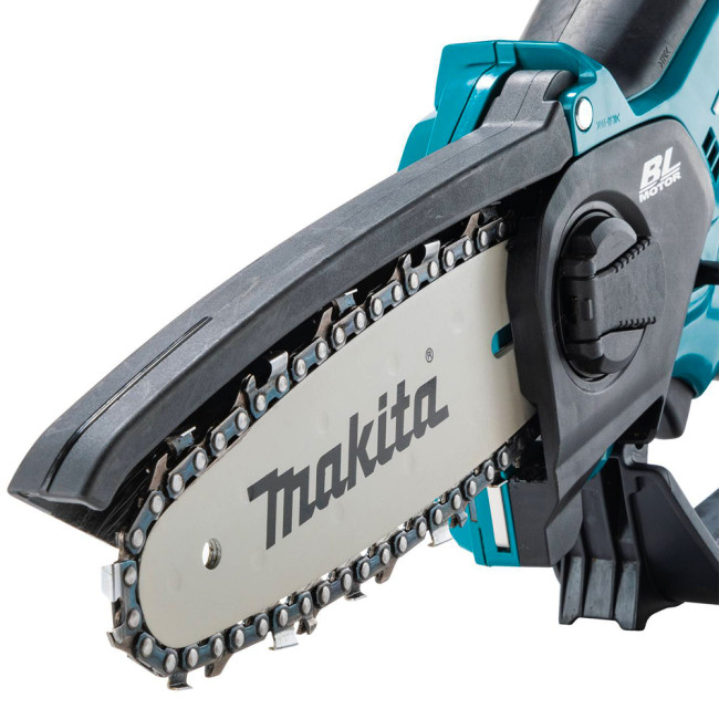 Makita представляет новую цепную пилу для частного применения DUC150. Данная цепная пила оснащена бесщеточным двигателем, который выдает максимальную мощность до 320 Вт. Максимальная скорость цепи составляет 8 м/с, а длина шины 15 см. Режущая гарнитура оснащена автоматической подачей масла, объем масленого бака 55 мл. Бесключевое натяжение цепи позволит быстро подтянуть провисшую цепь. Если цепь соскочит с шины, то широкая планка защитит пальцы пользователя.